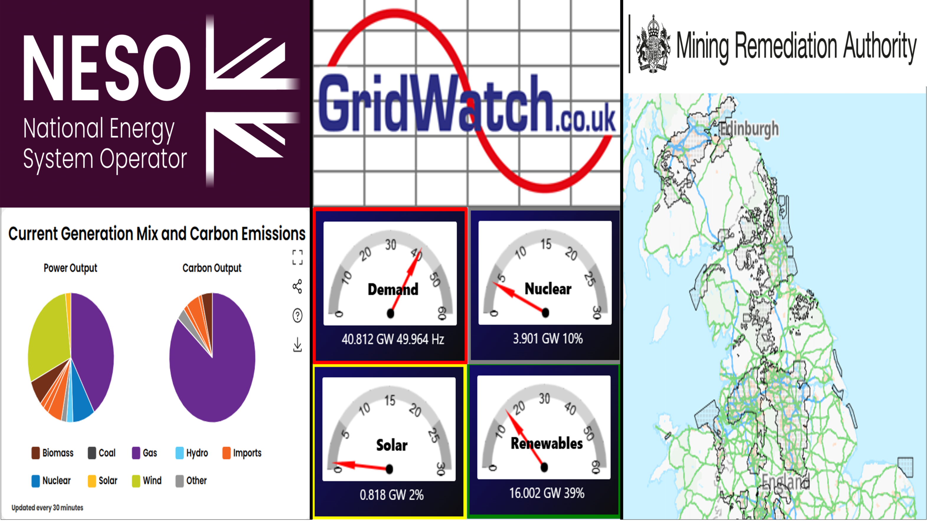 Access to three new visualisations are now available from our Visualisations tab. Information and links to the NESO Carbon Intensity Dashboard, GridWatch, and the Mining Remediation Authority Map Viewer can be found here. These visualisations contain useful displays on UK data such as the carbon impact of the Great Britain's electricity system, the distribution of different sources in Great Britain's power generation, and areas of which are affected by current and previous mining activities respectively.